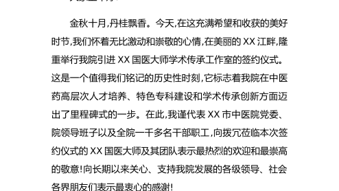 在引进XX国医大师学术传承工作室签约仪式上的致辞