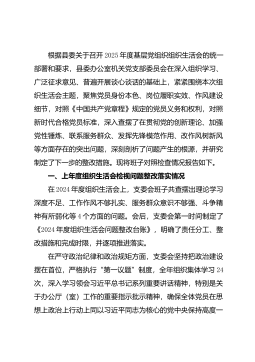 根据县委关于召开2025年度基层党组织组织生活会的统一部署和要求,县委办公室机关党支部委员会在深入组织学习、广泛征求意见、普遍开展谈心谈话的基础上,紧紧围绕本次组织生活会主题,聚焦党员身份本色、岗位履职实效、作风建设细节,对照《中国共产党章程》规定的党员义务和权利,对照新时代合格党员标准,深入查摆了在贯彻党的创新理论、加强党性锤炼、联系服务群众、发挥先锋模范作用、改作风树新风等方面存在的突出问题,深刻剖析了问题产生的根源,并研究制定了下一步的整改措施。现将班子对照检查情况报告如下。一、上年度组织生活会检视问题整改落实情况在2024年度组织生活会上,支委会班子共查摆出理论学习深度不足、工作作风不...