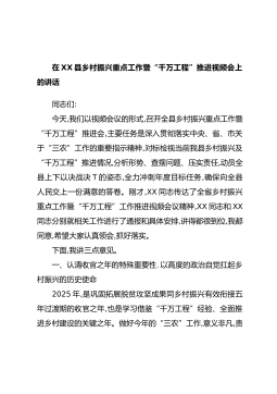 在XX县乡村振兴重点工作暨“千万工程”推进视频会上的讲话同志们:今天,我们以视频会议的形式,召开全县乡村振兴重点工作暨“千万工程”推进会,主要任务是深入贯彻落实中央、省、市关于“三农”工作的重要指示精神,对标检视当前我县乡村振兴及“千万工程”推进情况,分析形势、查摆问题、压实责任,动员全县上下以决战决T的姿态,全力冲刺年度目标任务,确保向全县人民交上一份满意的答卷。刚才,XX同志传达了全省乡村振兴重点工作暨“千万工程”工作推进视频会议精神,XX同志和XX同志分别就相关工作进行了通报和具体安排,讲得都很到位,我都同意,希望大家认真领会,抓好落实。下面,我讲三点意见。一、认清收官之年的特殊重要性,...