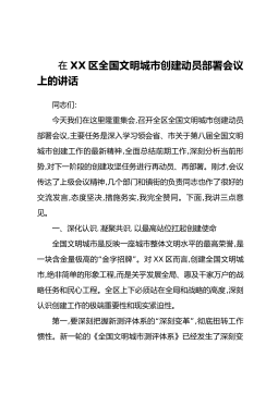 在XX区全国文明城市创建动员部署会议上的讲话同志们:今天我们在这里隆重集会,召开全区全国文明城市创建动员部署会议,主要任务是深入学习领会省、市关于第八届全国文明城市创建工作的最新精神,全面总结前期工作,深刻分析当前形势,对下一阶段的创建攻坚任务进行再动员、再部署。刚才,会议传达了上级会议精神,几个部门和镇街的负责同志也作了很好的交流发言,态度坚决,措施务实,我完全赞同。下面,我讲三点意见。一、深化认识,凝聚共识,以最高站位扛起创建使命全国文明城市是反映一座城市整体文明水平的最高荣誉,是“”一块含金量极高的金字招牌。对XX区而言,创建全国文明城市,绝非简单的形象工程,而是关乎发展全局、惠及千家万...