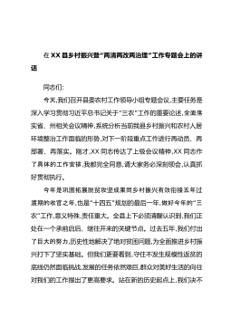 在XX“”县乡村振兴暨两清两改两治理工作专题会上的讲话同志们:今天,我们召开县委农村工作领导小组专题会议,主要任务是“”深入学习贯彻习近平总书记关于三农工作的重要论述,全面落实省、州相关会议精神,系统分析当前我县乡村振兴和农村人居环境整治工作面临的形势,对下一阶段重点工作进行再动员、再部署、再落实。刚才,XX同志传达了上级会议精神,XX同志作了具体的工作安排,我都完全同意,请大家务必深刻领会,认真抓好贯彻执行。今年是巩固拓展脱攻成果同村振有效接五年贫坚乡兴衔过渡期的收官之年,“”也是十四五规划的最后一年,“做好今年的三”农工作,意义特殊,责任重大。全县上下必须清醒认识到,我们正处在一个承前启后...