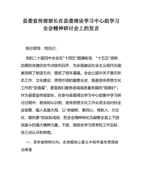 县委宣传部部长在县委理论学习中心组学习全会精神研讨会上的发言各位领导,同志们:党的二十届四中全会在"十四五"圆满收官、"十五五"扬帆启幕的关键历史节点胜利召开,为全面建设社会主义现代化国家指明了前进方向、提供了根本遵循。全会公报中关于意识形态工作、文化建设、思想引领的重要论述,既是宣传思想文化工作的"定盘星",更是我们服务县域高质量发展的"指南针"。作为县委宣传部部长,在参与县委理论学习中心组集中学习研讨过程中,我深刻认识到,宣传思想文化工作必须主动对标全会部署、融入发展大局,以"举旗帜、聚民心、育新人、兴文化、展形象"的实际成效,把全会精神转化为凝聚全县上下团结奋斗的强大精神力量。下面,我结...