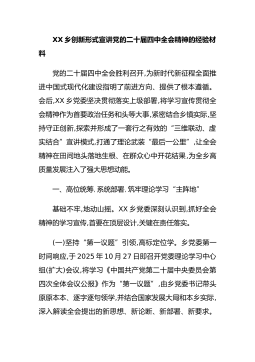 XX乡创新形式宣讲党的二十届四中全会精神的经验材料党的二十届四中全会胜利召开,为新时代新征程全面推进中国式现代化建设指明了前进方向、提供了根本遵循。会后,XX乡党委坚决贯彻落实上级部署,将学习宣传贯彻全会精神作为首要政治任务和头等大事,紧密结合乡镇实际,坚持守正创新,探索并形成了一套行之有效的“三维联动、虚实结合”宣讲模式,打通了理论武装“最后一公里”,让全会精神在田间地头落地生根、在群众心中开花结果,为全乡高质量发展注入了强大思想动能。一、高位统筹,系统部署,筑牢理论学习“主阵地”基础不牢,地动山摇。XX乡党委深刻认识到,抓好全会精神的学习宣传,首要在顶层设计,关键在责任落实。(一)坚持“第...