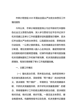 市审计局党组2025年落实全面从严治党主体责任工作情况报告今年以来,市审计局党组坚持以习近平新时代中国特色社会主义思想为指导,深入学习贯彻习近平总书记关于机关党建以及审计工作的重要讲话和重要指示精神,坚决扛牢全面从严治党主体责任,以高度政治自觉、思想自觉行动自觉,一以贯之狠抓落实。机关党建政治引领作用充分彰显,理论武装持续入脑入心走深走实,基层党组织政治功能和组织功能明显增强,纪律作风建设不断巩固加强机关党建制度和工作机制不断完善,机关党的建设全面提质增效,有效引领保障了审计工作高质量发展。一、主要工作情况(一)强化政治引领,筑牢政治忠诚。始终坚持审计机关首先是政治机关,深刻领悟“两个确立”的...
