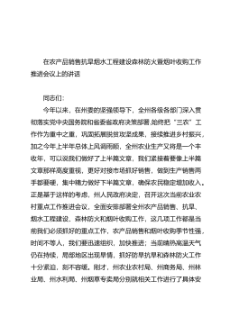在农产品销售抗旱烟水工程建设森林防火暨烟叶收购工作推进会议上的讲话同志们:今年以来,在州委的坚强领导下,全州各级各部门深入贯彻落实党中央国务院和省委省政府决策部署,始终把“三农”工作作为重中之重,巩固拓展脱贫攻坚成果,接续推进乡村振兴,加之今年上半年总体上风调雨顺,全州农业生产又将是一个丰收年,可以说我们做好了上半篇文章,我们紧接着要像上半篇文章那样高度重视,更好对接市场抓好销售,做到生产销售两手都要硬,集中精力做好下半篇文章,确保农民稳定增加收入。正是基于这样的考虑,州人民政府决定,召开这次当前农业农村重点工作推进会议,全面安排部署全州农产品销售、抗旱、烟水工程建设、森林防火和烟叶收购工作,...