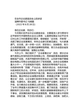 在全市企业家座谈会上的讲话淄博市委书记马晓磊(2022年8月28日)各位企业家、同志们:今天我们召开这次企业家座谈会,主要是深入学习贯彻习近平新时代中国特色社会主义思想,认真贯彻落实习近平总书记对山东工作的重要指示要求,继续锚定“走在前、开新局”,当面了解企业发展情况,听听企业家们的意见建议,与大家通通气、交交底,进一步统一认识、坚定信心、加油鼓劲,助力企业高质量发展,合力推动淄博转型跨越,努力为全国全省发展大局多作淄博贡献、淄博企业贡献。今天上午,我们组织了“企业家看企业”活动,部分企业家代表到山东恒利纺织科技有限公司、西铁城新景高端装备智能制造产业园、天辰齐翔新材料有限公司、山东新华医疗器...