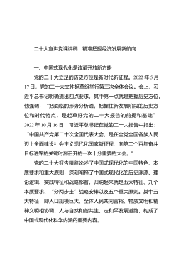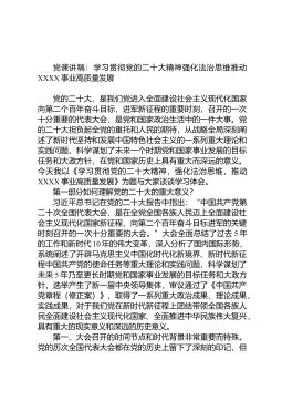 党课讲稿:学习贯彻党的二十大精神强化法治思维推动XXXX事业高质量发展党的二十大,是我们党进入全面建设社会主义现代化国家向第二个百年奋斗目标,进军新征程的重要时刻,召开的一次十分重要的代表大会,是党和国家政治生活中的一件大事。党的二十大担负起全党的重托和人民的期待,从战略全局深刻阐述了新时代坚持和发展中国特色社会主义的一系列重大理论和实践问题,科学谋划了未来一个时期党和国家事业发展的目标任务和大政方针,在党和国家历史上具有重大而深远的意义。今天我以《学习贯彻党的二十大精神,强化法治思维,推动XXXX事业高质量发展》为题与大家谈谈学习体会。第一部分如何理解党的二十大的重大意义?习近平总书记在党的...