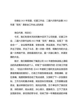 在煤业2023年党委、纪委工作会、二届六次职代会暨2022年度“双先”表彰会工作会上的讲话各位代表、同志们:今天,我们利用半天时间集中召开了公司党委、纪委工作会、二届六次职代会和2022年度“双先”表彰会,实现了“四会合一”,会议程序紧凑、安排合理、务实高效,开出了朝气、开出了团结、开出了斗志,是一次统一思想、明确方向的大会,是一次再鼓干劲、团结奋进的大会,是一次凝心聚力、共谋发展的大会。刚才,我们隆重表彰了集团公司2022年度各条战线上涌现出的先进集体和先进个人,听取了*总经理所作的《行政工作报告》、*总会计师所作的《2022年度职工福利支出和业务招待费使用情况的报告》。行政工作报告客观全面...