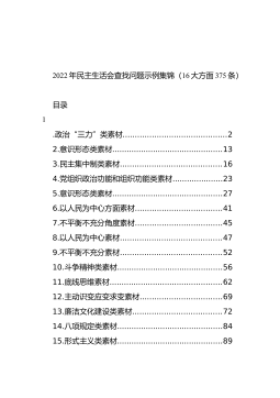 2022年民主生活会查找问题示例集锦(16大方面375条)目录1.政治“三力”类素材...........................................22.意识形态类素材..............................................133.民主集中制类素材..........................................164.党组织政治功能和组织功能类素材.....................235.意识形态类素材..............................................276.以人民为...