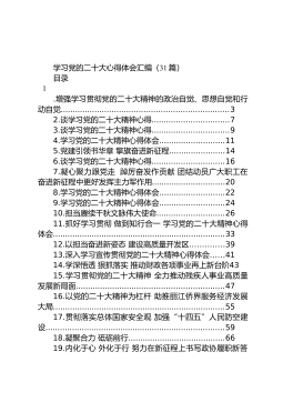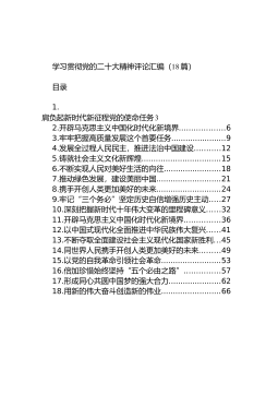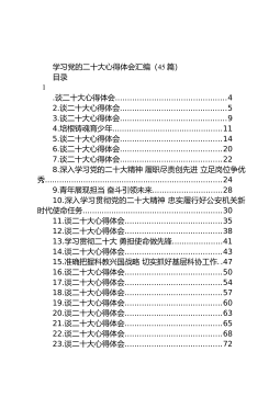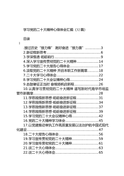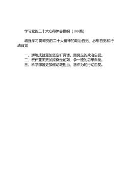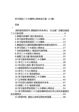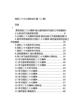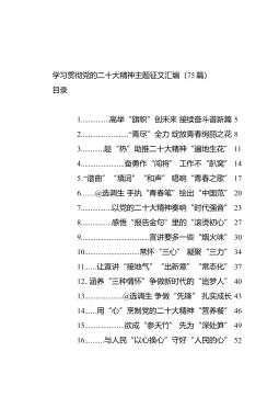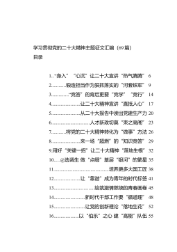 学习贯彻党的二十大精神主题征文汇编(75篇)目录1...............高举“旗帜”创未来接续奋斗谱新篇52.........................“青尽”全力绽放青春绚丽之花83............趁“热”助推二十大精神“遍地生花”114.......................奋勇作“闯将”工作不“趴窝”145.“谱曲”“填词”“和声”唱响“青春之歌”176.......@选调生手执“青春笔”绘出“中国范”207................以党的二十大精神奏响“时代强音”238................感悟“报告金句”里的“滚烫初心”279..........
