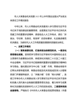 市人大常委会机关党委2025年上半年落实全面从严治党主体责任工作情况报告今年以来,市人大常委会机关党委深入学习贯彻习近平总书记关于党的建设的重要思想,全面落实习近平总书记关机关党建工作的重要讲话精神,紧密结合人大工作特点,紧扣“讲政治、守纪律、负责任、有效率”的目标要求,扎实推进模范机关建设,为新时代人大工作高质量发展提供坚强政治保证。一、主要工作情况(一)聚焦首要任务,打造讲政治的模范机关。一是深化思想理论武装。坚持把学习贯彻习近平新时代中国特色社会主义思想作为首要政治任务,持续深化对党的二十大及二十届三中全会精神、习近平总书记视察期间重要讲话重要指示精神的学习领会。强化理论学习中...