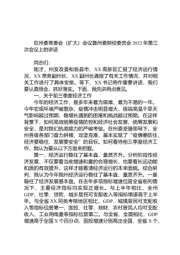 在州委常委会(扩大)会议暨州委财经委员会2022年第三次会议上的讲话同志们:刚才,州发改委和各县市、XX高新区汇报了经济运行情况,XX常务副州长、XX副州长通报了有关工作情况,并对相关工作进行了具体安排。等下,XX书记将作重要讲话,我们要认真领会,抓好落实。下面,我先讲两点意见。 一、关于前三季度经济工作今年的经济工作,是多年来最为艰难、最为不易的一年。今年宏观环境严峻复杂,疫情冲击明显增大,极端高温干旱天气影响超过预期,稳增长遇到的困难和挑战超过预期。在这样背景下,如何高效统筹疫情防控和经济社会发展,统筹发展和安全,是对我们执政能力的严峻考验。在州委坚强领导下,全州各级各部门奋力拼搏、攻坚...