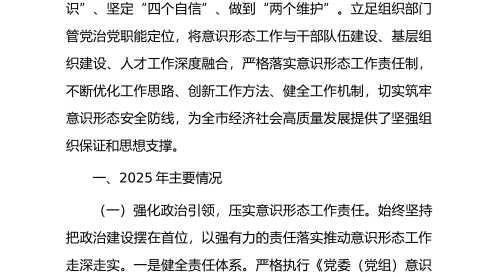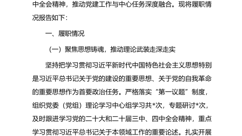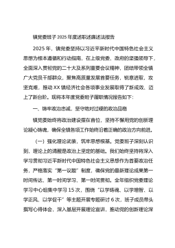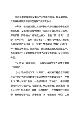 2025年度党委落实全面从严治党主体责任、抓基层党建、党风廉政建设责任制和反腐败工作情况总结一年来,镇党委坚持以习近平新时代中国特色社会主义思想为指导,全面贯彻落实党的二十大和二十届历次全会精神,深刻领悟“两个确立”的决定性意义,增强“四个意识”、坚定“四个自信”、做到“两个维护”,始终将全面从严治党作为最根本的政治担当,以“赶考”的清醒和“答卷”的自觉,一体推进主体责任、基层党建、党风廉政建设和反腐败工作,为全镇经济社会高质量发展提供了坚强有力的政治保证和组织保证。一、聚焦“政治铸魂”,在理论武装与看齐追随中把稳“方向盘”(一)坚持理论学习“扎深根”。镇党委坚持把学习贯彻习近平新时代中国特色...
