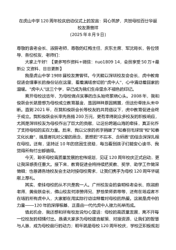 在虎山中学120周年校庆启动仪式上的发言:同心筑梦,共贺母校百廿华诞校友萧曾祥(2025年8月9日)尊敬的袁老会长、淑蔚老师,尊敬的红梅主任、庆东主席、军沈局长,各位领导、各位校友、老师们:大家上午好!【更多写作资料+微信:nuo180914,会员享受50万+最新公文资料,日日更新】我是虎山中学1988届校友萧曾祥。今天能以深圳校友会会长、虎中教育促进会理事长的身份站在这里,看着满场亲切的"虎中人",心中涌动着回家的温暖。"虎中人"这三个字,早已成为我们生命里永不褪色的印记。离开母校这些年,为母校做点实事的念头始终萦绕心头。2008年,我和俊跃会长就曾想为母校成立教育基金,虽因种种原因搁置,但...