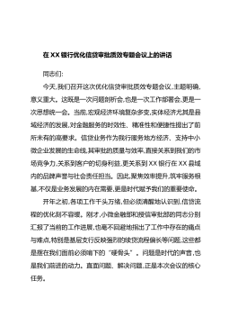 在XX银行优化信贷审批质效专题会议上的讲话同志们:今天,我们召开这次优化信贷审批质效专题会议,主题明确,意义重大。这既是一次问题剖析会,也是一次工作部署会,更是一次思想统一会。当前,宏观经济环境复杂多变,实体经济尤其是县域经济的发展,对金融服务的时效性、精准性和便捷性提出了前所未有的高要求。信贷业务作为我行服务地方经济、支持中小微企业发展的生命线,其审批的质量与效率,直接关系到我们的市场竞争力,关系到客户的切身利益,更关系到XX银行在XX县域内的品牌声誉与社会责任担当。因此,聚焦效率提升,筑牢服务根基,不仅是业务发展的内在需要,更是时代赋予我们的重要使命。开年之初,各项工作千头万绪,但必须清醒...