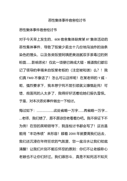 恶性集体事件宿舍检讨书恶性集体事件宿舍检讨书对于今天早上发生的,608宿舍集体缺席某BT集体活动的恶性集体事件,导致了饭堂少卖出十几份地沟油炸的油条染色的馒头,以及各类饭堂阿姨肥美油腻双手荼毒过的粥粉面……影响恶劣!仅此一项便已铸成大错-难道我们都忘记了领导的幸福来自饭堂老板的(注定被和谐)么?!我们真TMD不像话了!怎么可以这样呢!在某老师的Y威-呃,强烈要求下,我本想宁死不屈引颈就义慷慨赴死!可惜,前面死的人太多了,我得好好活着给她们报仇雪恨。于是,对本次恶劣事件做出一下检讨。悔过如下:………………此处省略一万字……再省略一万字……老师,我们错了,原不原谅您老看着办吧。我不保证下不为例!在...