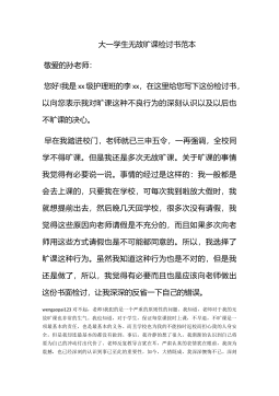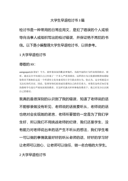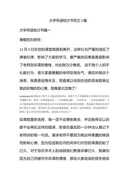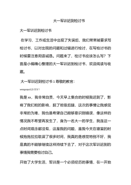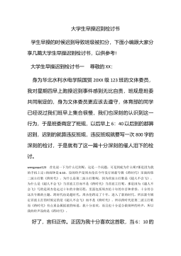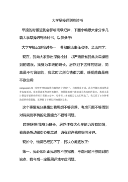 大学生早操迟到检讨书学生早操的时候迟到导致班级被扣分,下面小编跟大家分享几篇大学生早操迟到检讨书,以供参考!大学生早操迟到检讨书一尊敬的XX:身为华北水利水电学院国贸20XX级123班的文体委员,我对星期四早上跑操迟到事件感到无比自责,班规是班委共同制定的,身为文体委员更应该去遵守,体育部的同学已经说过我们班早上集合很慢,我们也深刻的认识到这一行为,于是班委商定了班规,以后早上6:40以后到的都算迟到,迟到的就算违反班规,违反班规就要写一次800字的深刻的检讨,于是就有了这一篇十分深刻的催人泪下的检讨。wengaopai123首先说一下为什么迟到呢,这是一个问题,可是到底为什么呢?那是因为我的...