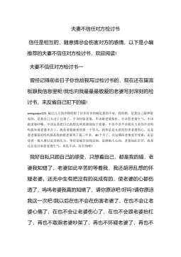 夫妻不信任对方检讨书信任是相互的,随意猜忌会伤害对方的感情,以下是小编推荐的夫妻不信任对方检讨书,欢迎阅读!夫妻不信任对方检讨书一曾经记得前些日子你也给我写过检讨书的,现在还在留言板跟我信息里呢!我也向我最最最敬爱的老婆写封深刻的检讨书,来反省自己犯下的错!wengaopai123最近几天我冷静的想了好多好多的确是我的不对,我的错,是我自己疑神疑鬼的,是我自己太过于自我了,不该怀疑老婆,不该跟老婆抬杠,不该惹老婆生气,不该跟老婆吵嘴,不该总是把自己的想法和思绪强加于老婆,不该不该不该我有太多的不该呜呜我知道老婆幸苦了,我是老婆最爱的第一个男人,我却总是无意的伤害老婆的心。总是惹老婆落泪呜呜都是...