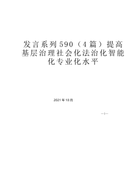 发言系列590(4篇)提高基层治理社会化法治化智能化专业化水平2021年10月—1—目录1.重庆市中国特色社会主义理论体系研究中心市委党校分中心孙婷:提升基层治理社会化水平的三个维度………………………………………12.西南政法大学行政法学院教授、博导陆幸福:提升基层社会治理法治化水平………………………………………………33.重庆交通大学经管学院二级教授、重庆市学术技术带头人李友根:数字化技术让基层治理更智慧………………………………………………54.重庆市委政法委刘明月、王卫波:抓实“四个治理”提高基层治理专业化水平………………………………7—1—提高基层治理社会化法治化智能化专业化水平(202...