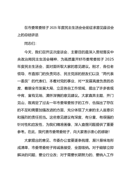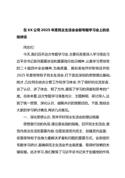 在XX公司2025年度民主生活会会前专题学习会上的总结讲话同志们:今天,我们召开这次专题学习会,主要任务是深入学习领会习近平总书记系列重要讲话和重要指示批示精神,认真学习贯彻党的二十届四中全会精神,为高质量、高标准地开好即将召开的2025年度领导班子民主生活会,打下坚实深刻的思想理论基础。刚才,几位同志结合分管工作和学习体会,作了很好的交流发言,谈了认识、讲了体会、明了方向,展现了学习的深度和思考的广度。总体来看,这次专题学习准备充分、主题鲜明、研讨深入,达到了统一思想、深化认识、凝聚共识的预期目的。下面,我结合大家的学习研讨情况,再讲几点意见。一、深化思想认识,筑牢开好民主生活会的理论根基思...