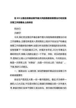 在XX公路总段春运春节重大风险隐患排查整治行动实施方案工作部署会上的讲话同志们:大家好!今天,我们在这里召开春运春节重大风险隐患排查整治行动工作部署会,主要任务是深入贯彻落实上级关于安全生产和春运保障工作的最新指示精神,全面分析当前我们所面临的安全形势,安排部署下一阶段的重点工作。时值岁末年初,2026年春运大幕即将拉开,保障人民群众度过一个平安、祥和、欢乐的新春佳节,是我们公路人义不容辞的政治责任和光荣使命。今天的会议,既是一次思想上的“对表会”,也是一次行动上的“动员会”。下面,我讲三点意见。一、提高站位,认清形势,深刻把握做好春运安全保障工作的极端重要性安全生产是民生大事,一丝一毫不能放...