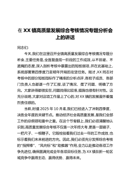 在XX镇高质量发展综合考核情况专题分析会上的讲话同志们:今天,我们在这里召开全镇高质量发展综合考核情况专题分析会,主要任务是,全面复盘前一阶段的工作成效,以不回避、不遮掩的态度,深入剖析考核中暴露出的短板弱项,并在此基础上,系统部署第四季度乃至明年开局的攻坚任务。刚才,XX同志对考核中的部分短板指标作了精准的分析点评,各班子成员、各部门负责人也都逐一作了汇报,谈了情况、摆了问题、明确了方向。大家讲得都很实在,问题找得比较准,措施也很有针对性。这充分说明,大家对这项工作是上了心的,对XX镇的发展是怀着强烈责任感的。当前,时值2025年10月底,我们已经进入了冲刺四季度、决胜全年度的关键节点。推动...