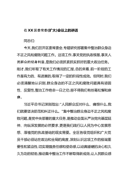 在XX区委常委(扩大)会议上的讲话同志们:今天,我们召开区委常委会,专题研究部署集中整治群众身边不正之风和腐败问题工作。这项工作,事关党的执政根基,事关人民群众的切身利益,是我们必须抓紧抓实抓好的重大政治任务。刚才,我们听取了有关工作情况的汇报,总的来看,前一阶段的工作是有力的、有进展的,取得了一定的阶段性成效。但同时,我们必须清醒地认识到,群众身边的不正之风和腐败问题具有顽固性、反复性,整治工作绝非一日之功,容不得我们有丝毫松懈和麻痹。习近平总书记深刻指出:“人民群众反对什么、痛恨什么,我”们就要坚决防范和纠正什么。集中整治群众身边不正之风和腐败问题,是党中央部署的重大任务,是推动全面从严治...
