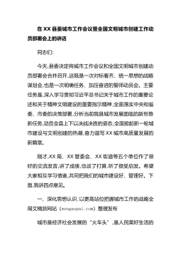 在XX县委城市工作会议暨全国文明城市创建工作动员部署会上的讲话同志们:今天,县委决定将城市工作会议和全国文明城市创建动员部署会合并召开,这既是一次对标看齐、统一思想的战略谋划会,也是一次明确任务、加压奋进的誓师动员会。主要任务是,深入学习贯彻习近平总书记关于城市工作的重要论述和关于精神文明建设的重要指示精神,全面落实中央和省委、市委的决策部署,分析当前我县城市发展面临的新形势新任务,动员全县上下以决战决胜的姿态,全面掀起新一轮城市建设与文明创建的热潮,奋力谱写XX城市高质量发展的新篇章。刚才,XX局、XX管委会、XX街道等五个单位作了很好的交流发言,讲了成绩,也谈了打算,听了很受启发。希望大家...