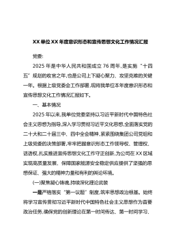 XX单位XX年度意识形态和宣传思想文化工作情况汇报党委:2025年是中华人民共和国成立76周年,是实施“十四五”规划的收官之年,也是公司上下凝心聚力、攻坚克难的关键一年。根据上级党委会工作部署,现将我单位本年度意识形态和宣传思想文化工作情况汇报如下。一、基本情况2025年以来,我单位党委坚持以习近平新时代中国特色社会主义思想为指导,深入学习贯彻习近平文化思想,全面落实党的二十大和二十届三中、四中全会精神,紧紧围绕集团公司党组和上级党委的决策部署,牢牢把握意识形态工作领导权、管理权、话语权,扎实推进宣传思想文化工作守正创新,为公司在XX区域实现高质量发展、保障国家能源安全稳定供应提供了坚强的思想...