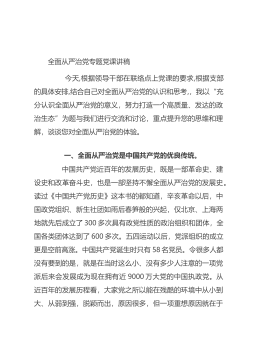 全面从严治党专题党课讲稿 今天,根据领导干部在联络点上党课的要求,根据支部的具体安排,结合自己对全面从严治党的认识和思考,,我以“充分认识全面从严治党的意义,努力打造一个高质量、发达的政治生态”为题与我们进行交流和讨论,重点提升您的思维和理解,谈谈您对全面从严治党的体验。 一、全面从严治党是中国共产党的优良传统。 中国共产党近百年的发展历史,既是一部革命史、建设史和改革奋斗史,也是一部坚持不懈全面从严治党的发展史。读过《中国共产党历史》这本书的都知道,辛亥革命以后,中国政党组织、新生社团如雨后春笋般的兴起,仅北京、上海两地就先后成立了300多次具有政党性质的政治组...