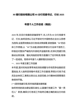 XX银行股份有限公司XX分行党委书记、行长2025年度个人工作总结(精品)2025年,在总行党委的坚强领导下,本人作为XX分行党委书记、行长,始终坚持以习近平新时代中国特色社会主义思想为指导,全面贯彻落实总行各项决策部署,紧密围绕“XX”的总体工作思路,以“XX”为主题,团结和带领分行全体干部员工,积极应对复杂严峻的内外部经济金融形势,在深化党建引领、推动业务发展、强化风险防控等方面履行了应尽职责,取得了一定成效。现将本年度个人履职情况总结如下。一、2025年度主要工作回顾本年度,面对机构改革带来的深刻调整与市场竞争加剧的双重挑战,本人始终坚持稳中求进工作总基调,带领分行班子成员及全体员工,聚...