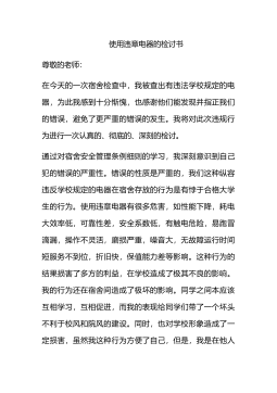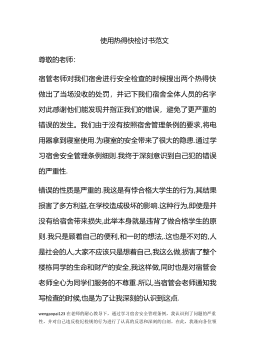 使用热得快检讨书范文尊敬的老师:宿管老师对我们宿舍进行安全检查的时候搜出两个热得快做出了当场没收的处罚,并记下我们宿舍全体人员的名字对此感谢他们能发现并指正我们的错误,避免了更严重的错误的发生。我们由于没有按照宿舍管理条例的要求,将电用器拿到寝室使用.为寝室的安全带来了很大的隐患.通过学习宿舍安全管理条例细则.我终于深刻意识到自己犯的错误的严重性.错误的性质是严重的.我这是有悖合格大学生的行为,其结果损害了多方利益,在学校造成极坏的影响.这种行为,即使是并没有给宿舍带来损失,此举本身就是违背了做合格学生的原则.我只是顾着自己的便利,和一时的想法,.这也是不对的,人是社会的人,大家不应该只是想着...