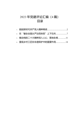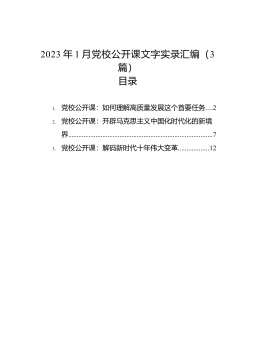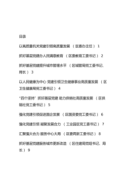 目录以高质量机关党建引领高质量发展(区委办主任)1抓好基层党建办人民满意教育(区委教育工委书记)2抓好基层党建提升城市管理水平(区城管局党工委书记、局长)3以人民健康为中心党建引领卫生健康事业高质量发展(区卫生健康局党工委书记)4“四个坚持”抓好基层党建助力供销社高质量发展(区供销社党工委书记)5强化党建引领促进国企发展(区国资委党工委书记)6强化党建引领凝聚发展合力(工业园区党工委书记)7汇聚强大合力服务中心大局(区委两新工委书记)8抓好基层党建服务城市更新改造(区住建局党组书记、局长)9筑牢主责强基础党建引领促发展(区统计局党组书记、局长)10党建引领筑堡垒真抓实干促发展(区总工会党组书记...