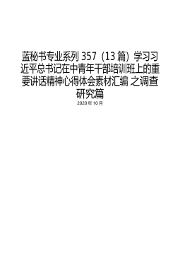 蓝秘书专业系列357(13篇)学习习近平总书记在中青年干部培训班上的重要讲话精神心得体会素材汇编之调查研究篇2020年10月目录1.一新:年轻干部大调研是激发干部新担当新作为的实举措12.财政部机关党委:以基层调研促进青年干部成长进步33.邱然、陈思、黄珊:“习近平同志不仅重视调研、躬行调研,而且讲究科学调研、高效调研”习近平在福建(十七)54.夏津县委组织部霍琳:加强调查研究提升能力水平225.中国社会科学院马克思主义研究院副研究员陈建波:调查研究就要把人民放在心中236.傅志东:调查研究要求真务实257.李慧勇:发扬好调查研究优良传统278.中共北京市委党校领导科学教研部副主任杨守涛:调查...