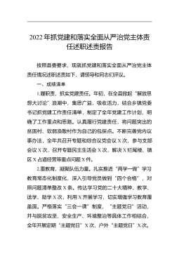 2022年抓党建和落实全面从严治党主体责任述职述责报告按照县委要求,现就抓党建和落实全面从严治党主体责任情况述职述责如下,请领导和同志们评议。一、成绩清单1.履职责,抓实党建责任。年初,在全县掀起“解放思想大讨论”浪潮中,集思广益,吸收活力,结合乡镇党委书记抓党建工作责任清单,制定了全年党建工作计划,明确了工作重点和思路。认真履行党建责任,将问题突出的贫困村、软弱涣散村作为自己的包保点。不断完善党内议事办法,全年共召开专题和综合议党会议X次,参与支部会议X次,召开专题民主生活会X次,解决X烂尾楼、镇区X占道经营等重点问题X件。2.重教育,凝聚队伍力量。扎实推进“两学一做”学习教育常态化制度化,...