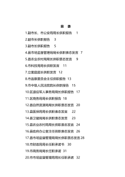 目录1.副市长、市公安局局长供职报告12.副市长供职报告33.副市长供职报告54.县市场监督管理局局长供职表态发言75.县农业农村局局长供职表态发言96.市科技局局长供职发言117.立案庭庭长供职发言128.市监察委员会主任供职报告139.市中级人民法院院长供职报告1510.区退役军人事务局局长供职报告1711.区商务局局长供职报告1812.县自然资源局局长供职表态发言2013.县医保局局长供职表态发言2214.县卫健局局长供职表态发言2315.县农业农村局局长供职表态发言2416.县政府办公室主任供职表态发言2617.县市场监督管理局局长供职表态发言2818.市财政局局长任职承诺书3019....